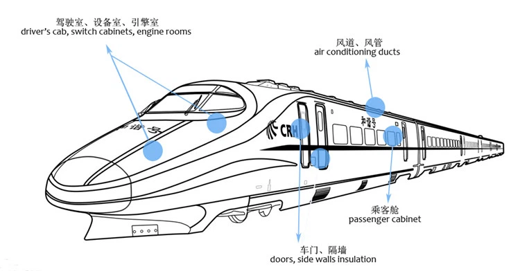 Esimerkiksi: levitaatiojunien, nopea rautatievaunujen ja ilmastointiputkien eristyksen vähentäminen, maanalainen autoeristyksen melun vähentäminen, raitiovaunuleturien melun vähentäminen ja niin edelleen ilmastointiputken eristys ja niin edelleen;