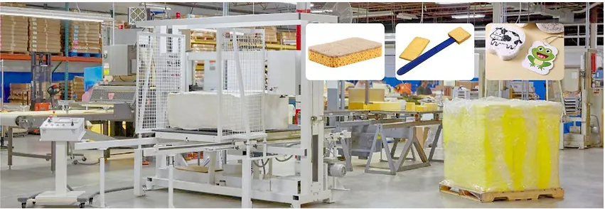4. Nyt kun kaikki on valmis, työntekijöiden on leikattava se ja pakata se. Monilla valmistajilla on tuotemerkki ja he pakatavat sen pakkaukseensa. Samanaikaisesti monet valmistajat myyvät raa'an selluloosan sieniä muuntajaksi nimeltään. Sitten he leikkasivat sienet asiakkaansa vaatimukseksi ja pakkaavat heidät omaan pakkaukseensa. Päävalmistusosastossa työntekijät leikkaavat sen automaattisen leikkurin läpi. Koneeseen laitetaan valtavat suorakaiteen muotoiset sienet ja ne asettavat koon leikkaamiseen.